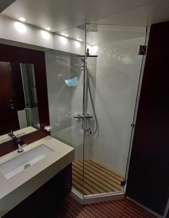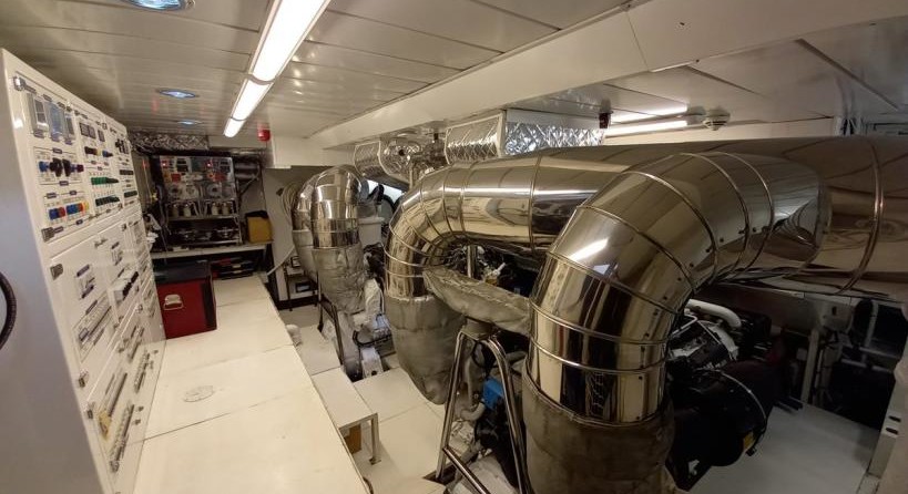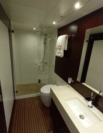 With a beam of 7.24 m and a draft of 2.2 m, she has a GRP hull and GRP superstructure. This adds up to a gross tonnage of 231 tons.
