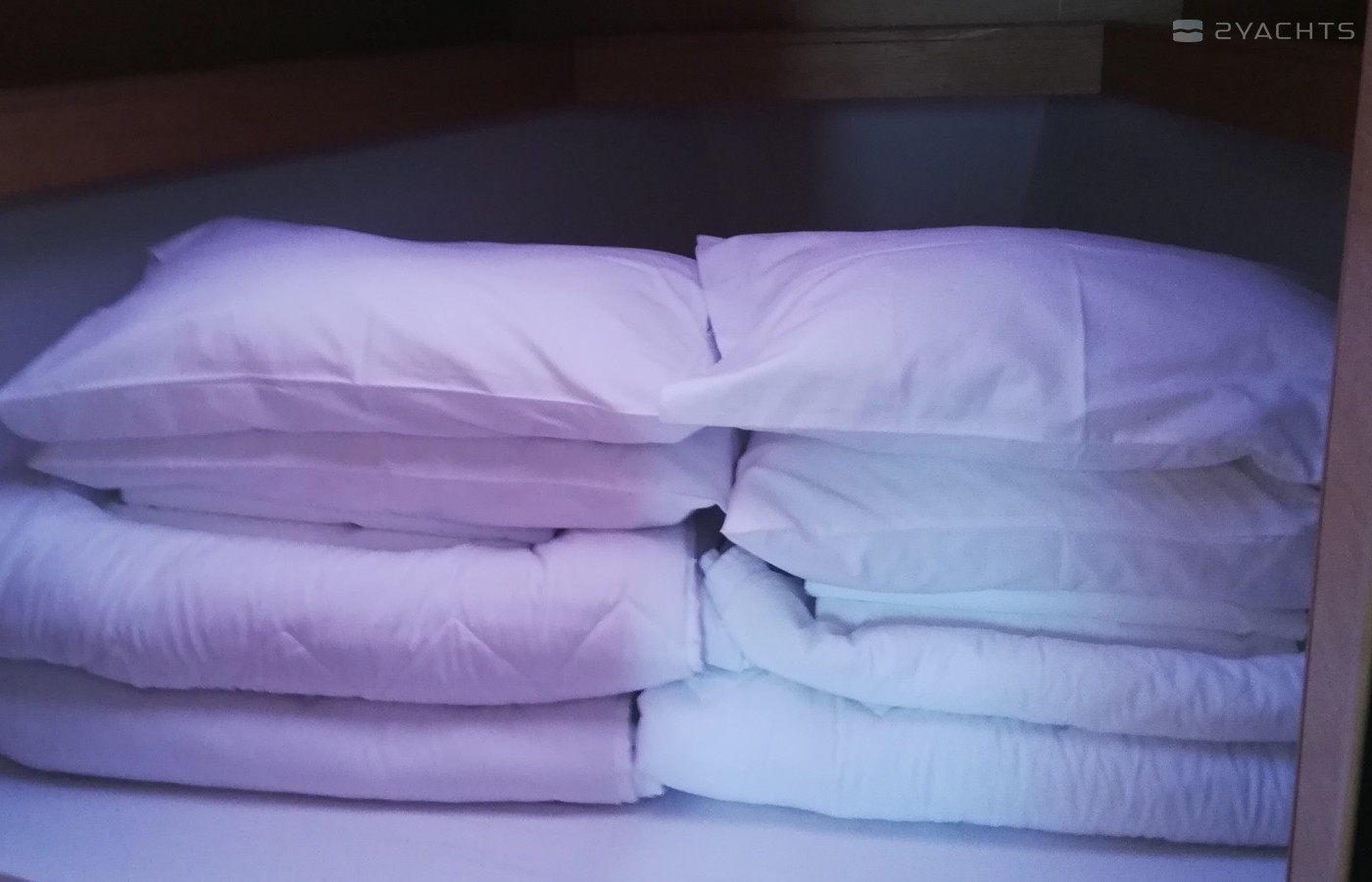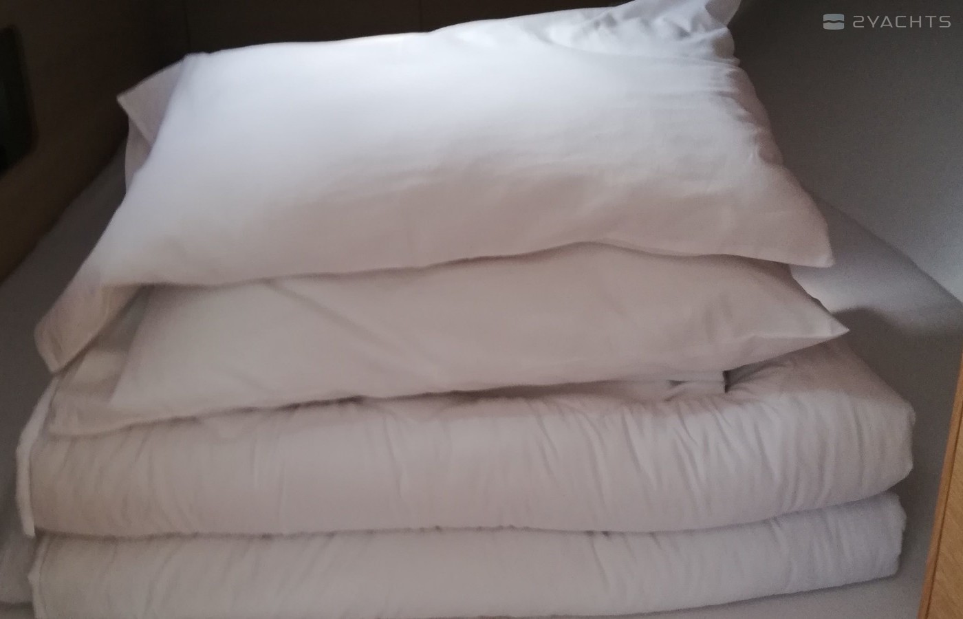 Lucky can accommodate up to 8 people in 3 double cabins and a saloon with 2 extra beds. Pillows and blankets are included in the price.