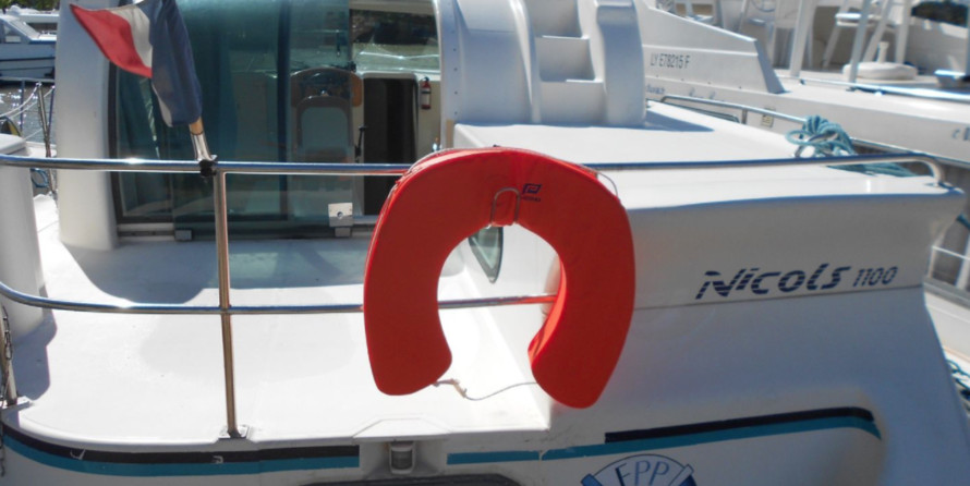 The Nicols Confort 1100 Les Canalous 98 houseboat was built in 1998, and it is docked in Port de Redon, France.