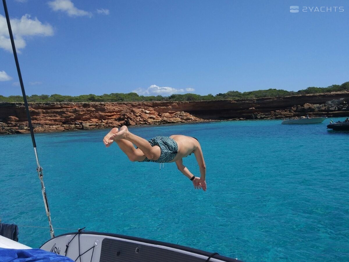 Boat equipment features classical mainsail, electric winches, solar panels, radar, salon gps plotter and bimini. It also boasts an an audio system, outside speakers, free stand up paddleboard, stand up paddle and inside speakers. The fully-equipped galley includes a coffee machine, oven, cooker, sink and kitchen utensils.