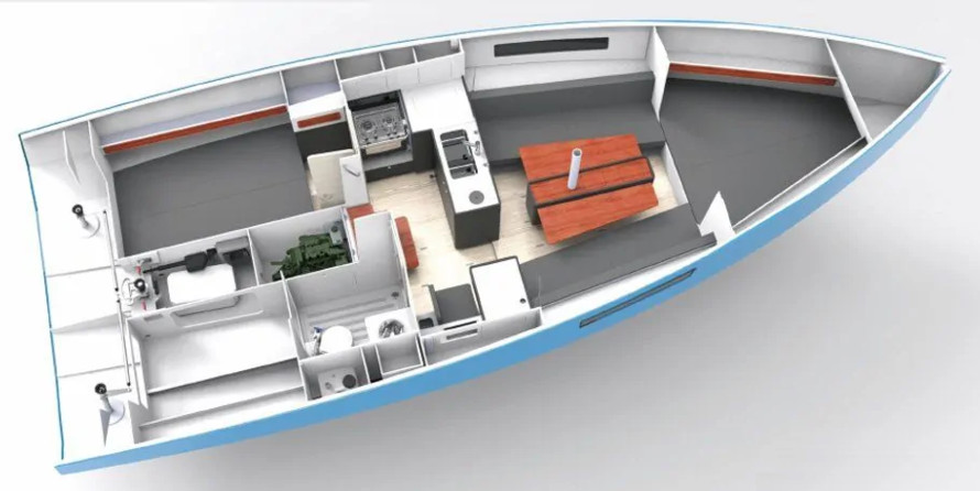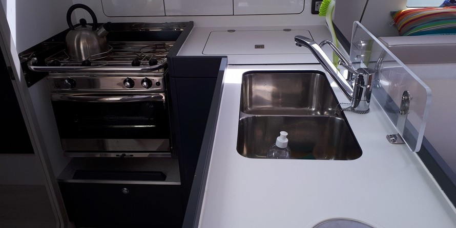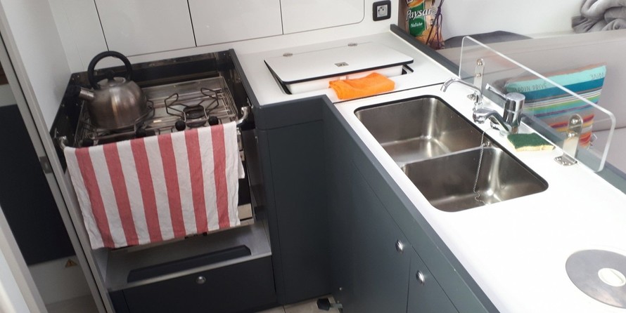 Boat equipment features classical mainsail, bimini and outside gps plotter. It also boasts a heating, an audio system, outside speakers and inside speakers. The fully-equipped galley includes an oven, cooker, sink and kitchen utensils.