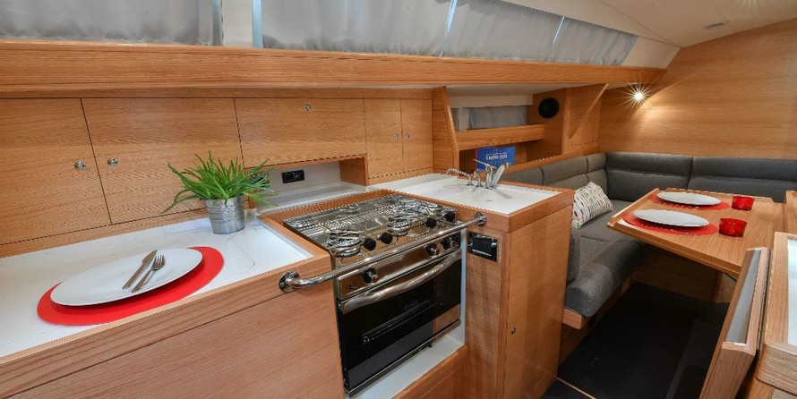 Boat equipment features classical mainsail, solar panels, bimini and bow thruster. It also boasts a heating, an audio system and inside speakers. The fully-equipped galley includes an oven, cooker, sink and kitchen utensils.