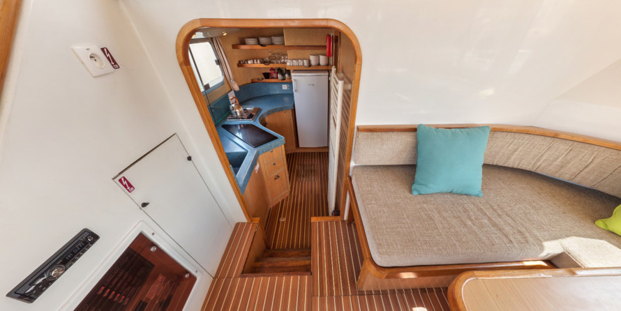 A well-equipped galley with oven, cooker, sink and kitchen utensils is prepared to facilitate cooking. There is also a coffee machine on board.