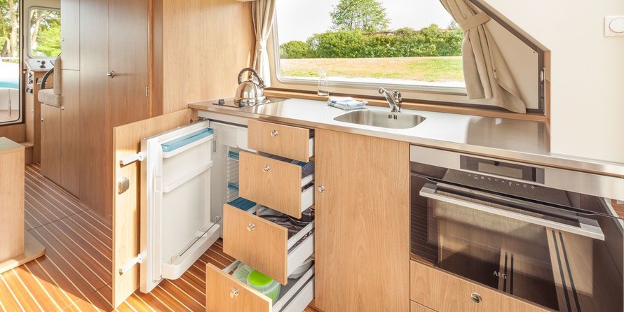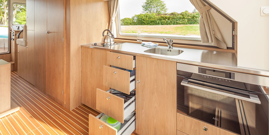 A well-equipped galley with oven, cooker, sink and kitchen utensils is prepared to facilitate cooking. There is also a microwave on board.
