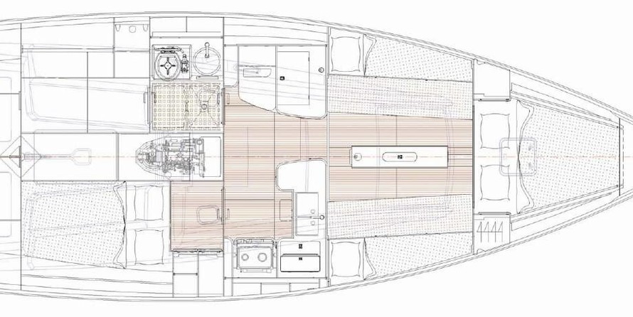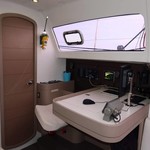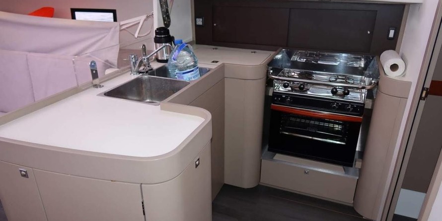 Boat equipment features classical mainsail, radar, salon gps plotter and bimini. It also boasts a heating, an audio system and inside speakers. The fully-equipped galley includes an oven, cooker, sink and kitchen utensils.
