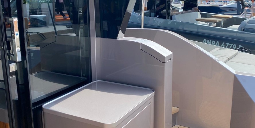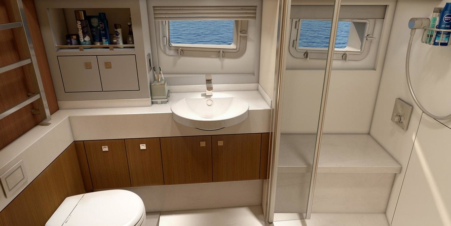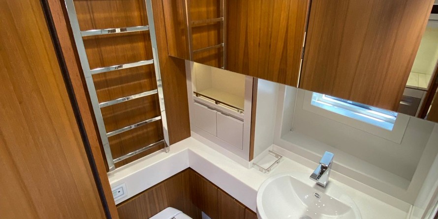 2x600HP x Volvo Penta D8-IPS800 ✓ ✓ Fire extinguishing system in the engine room ✓ ✓ 2x fire dumpers in the engine room ✓ ✓ Engine room ventilation Generator 9kW Lombardini ✓ ✓ Inverter 12v 7000W, Victron Energy ✓ ✓ Battery charger, Victron Energy ✓ ✓ Shore power connection ✓ ✓ Deck lighting Navigation/Electronics Garmin display 17" ✓ ✓ Garmin displays 2x7" ✓ ✓ GPS antenna Heating and Cooling system Heating systems 2x5kw Webasto ✓ ✓ Air-conditioning system Webasto Bathroom and WC Electric flush toilet ✓ ✓ Shower cabin ✓ ✓ Heated towel rails