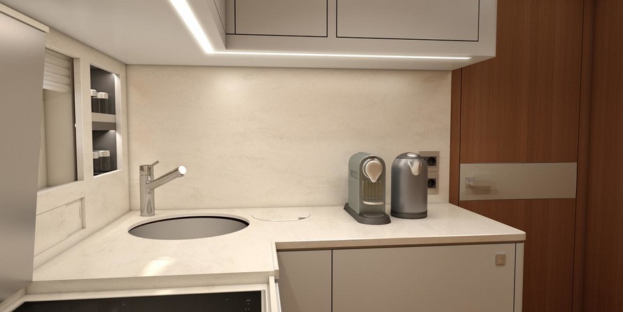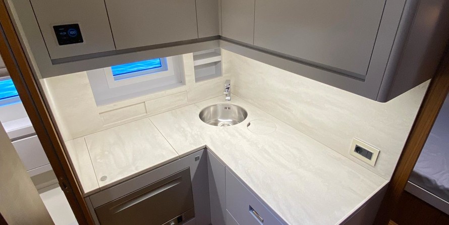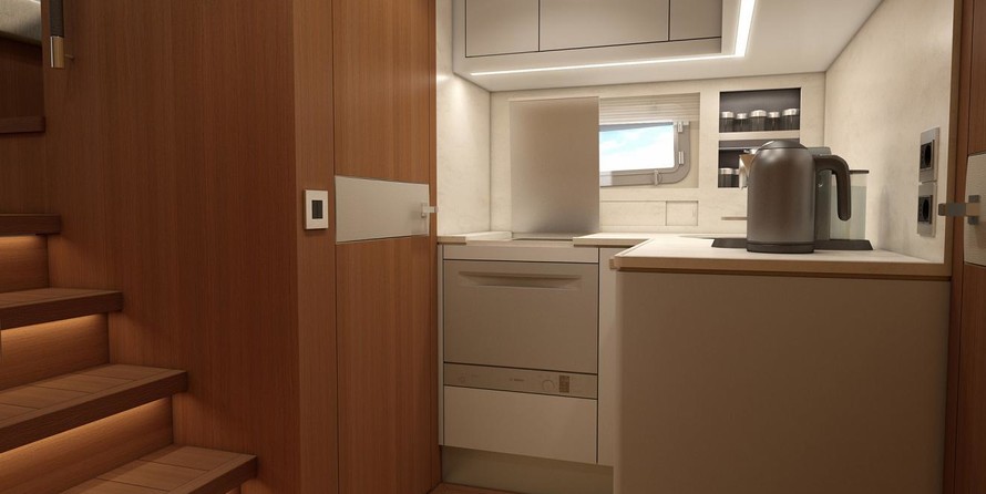 Saloon Furniture in Oak finishing ✓ ✓ Dashboard with soft anti-glare coating ✓ ✓ Electric Sun Roof ✓ ✓ Saloon table with an electric lift ✓ ✓ Large U-shaped sofa ✓ ✓ 2 x 220V sockets Painted and Oak finished furniture ✓ ✓ Hatch over the bed ✓ ✓ 2x reading lights ✓ ✓ 3x 220V sockets ✓ ✓ Guest cabin Painted and Oak finished furniture ✓ ✓ 2x reading lights ✓ ✓ 220V socket Galley Corian worktop ✓ ✓ Fridge ✓ ✓ 3x 220V sockets.