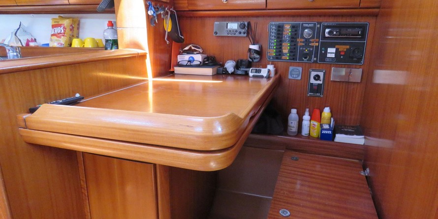 In cockpit: Multifunction display, AIS 2019. ST6001 autopilot. TRIDATA ST60, wind ST60, upwind angle ST60. VHF + dsc. Raymarine Plotter touch screen 2019