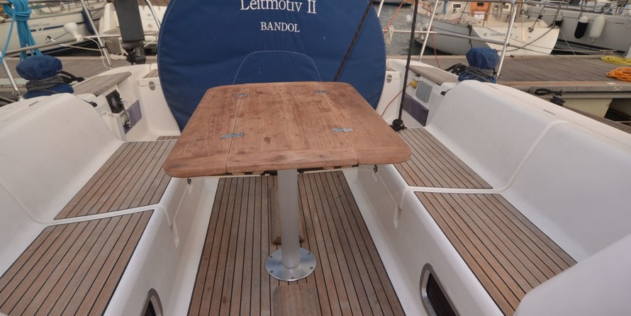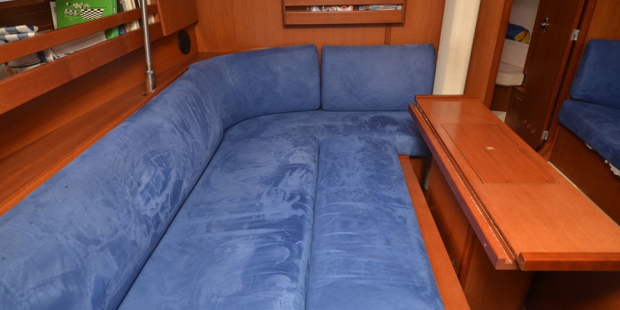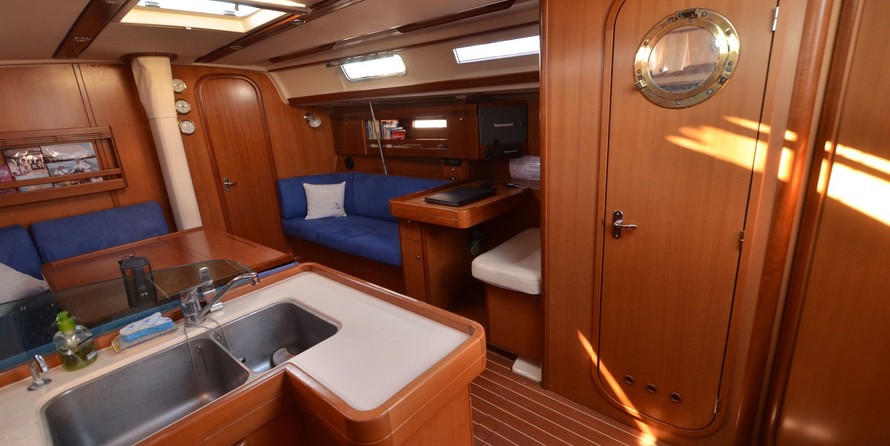 Boat equipment features rolling mainsail, salon gps plotter, bimini and bow thruster. It also boasts an an audio system and inside speakers. The fully-equipped galley includes an oven, cooker, sink and kitchen utensils.