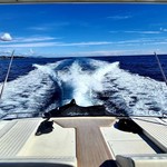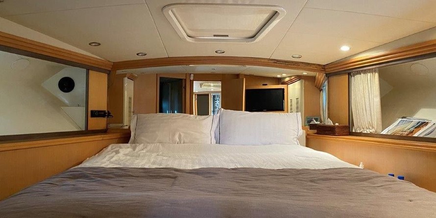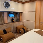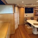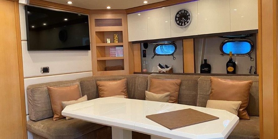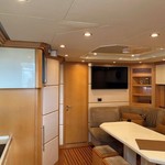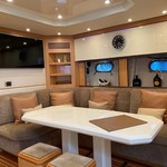 Boat equipment features radar, generator, bimini and bow thruster. It also boasts a flat screen tv, heating, air conditioning, an audio system and outside speakers. The fully-equipped galley includes a microwave, ice maker, freezer, coffee machine and oven.