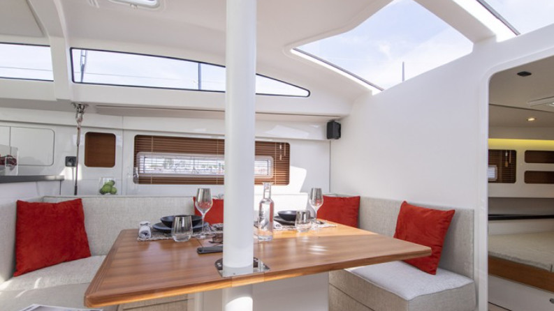Clin d'Oeil can accommodate up to 8 people in 3 double cabins and a saloon with 2 extra beds. Pillows and blankets are included in the price.
