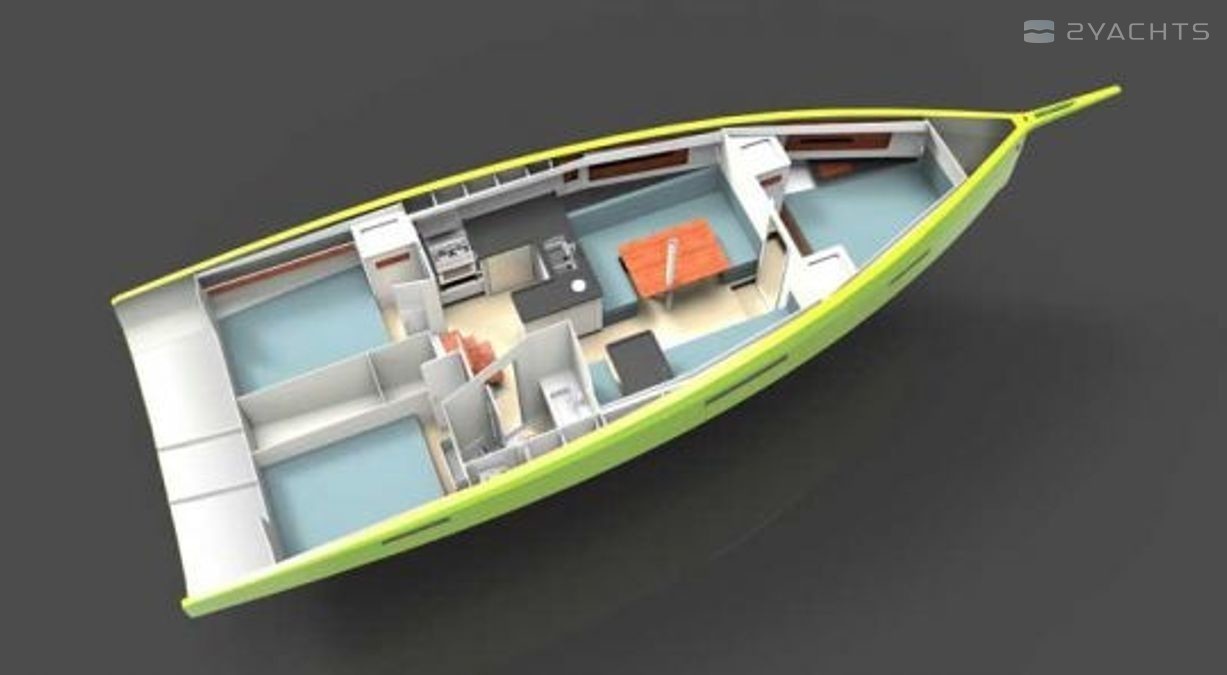 Boat equipment features classical mainsail and bimini. It also boasts a heating, an audio system, outside speakers and inside speakers. The fully-equipped galley includes an oven, cooker, sink and kitchen utensils.