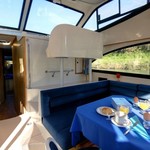 This houseboat is equipped with bathing platform. In chilly weather, guests will benefit from heating. an audio system, flybridge and inside speakers are also available.