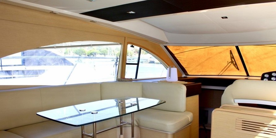 Boat equipment features radar, generator, salon gps plotter, bimini and bow thruster. It also boasts a heating, air conditioning, an audio system, outside speakers and flybridge. The fully-equipped galley includes a microwave, dishwasher, freezer, coffee machine and oven.