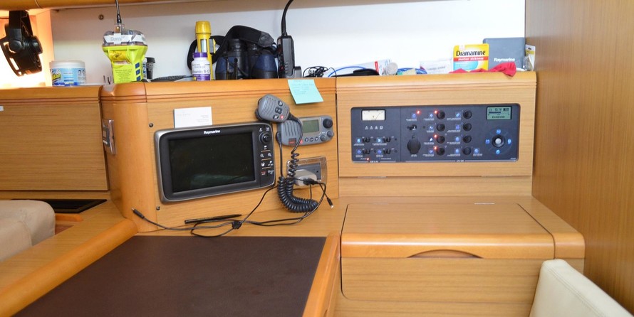 LARGE STORAGE SPACE under electrical panel with pneumatically-assisted opening for books and other navigation equipment