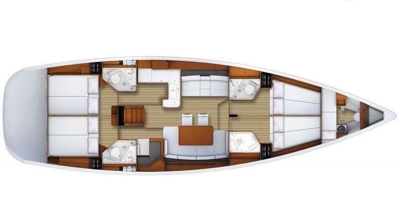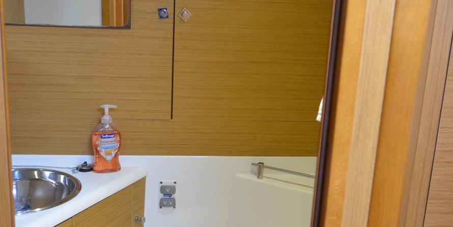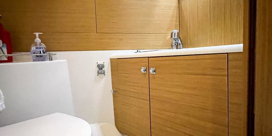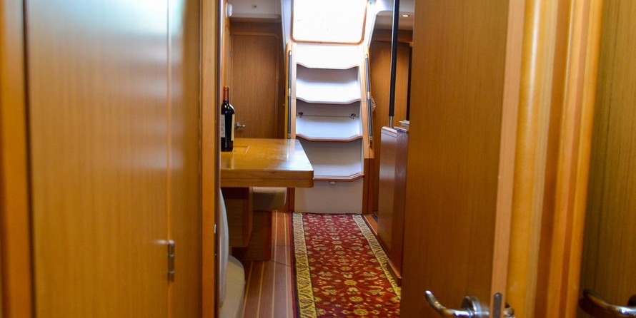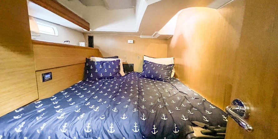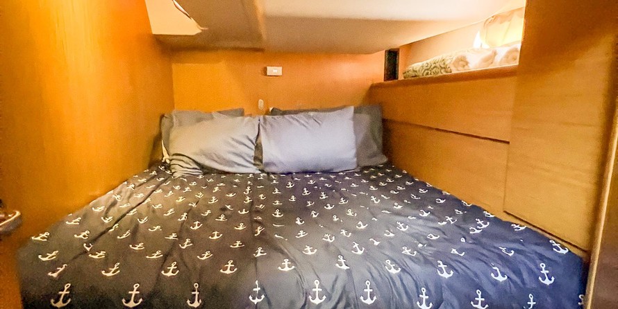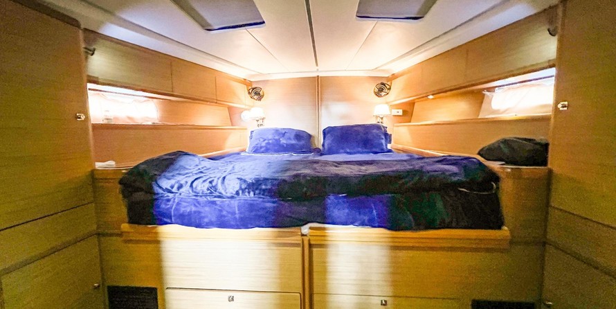The vessel was a 4 cabin 4 head layout - converted into an owner's layout. While in France the original owner had the 2 fwd cabins converted to one. This gives you a King-Size berth and His/Hers heads.
