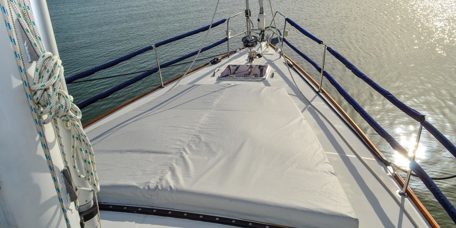 Forward Bow cushion just ahead of the Staysail deck traveler
