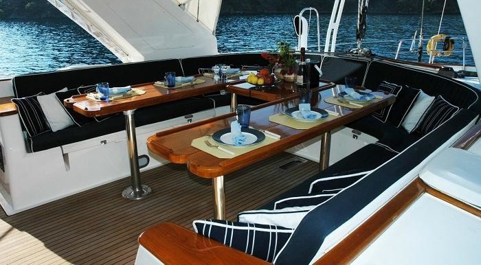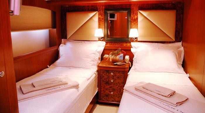 Парусная яхта Южный Крест-очень хорошо оборудованная и просторная 100 футов Макси МГК 88 разработан Спаркмэн и Стефенс. Он предлагает комфортное размещение для восьми гостей в четырех двухместных каютах, плюс три экипажа. Южный Крест также имеет превосходный гидравлическая платформа подходит для проведения огромного Тузик или для дайвинга, а также охраняемый центр салона.